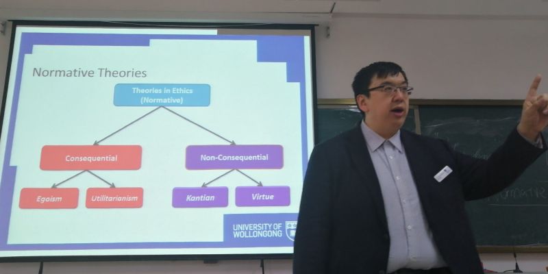 在本学期的首次课堂上,黄老师采用中英双语结合的表达,国际前沿的案例,讲解了功利主义、道义主义等多种道德哲学,并用他自己打拼的故事鼓励同学们努力学习,用认真严谨的态度对待自己的人生。他时而幽默的话语,时而语重心长的表达,带动着整个课堂气氛,取得了较好的教学效果。