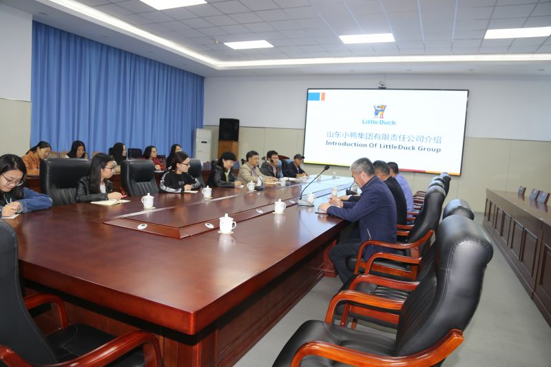 参观结束后,李永刚董事长协同人力资源管理相关负责人参与了校企双方的座谈交流。副总经理王总首先对小鸭集团基本情况进行概述,并围绕三大主营产业介绍了其发展现状、优势条件及人才建设情况。李永刚董事长在对整体产业运作进行了简要说明,向师生一行着重介绍了小鸭集团的发展与规划,其立足于对新旧动能转换政策环境及组织内部实际情况的考量,创新性地提出了推进产业转型、园区升级和国际战略三大工程(三纵),并贯穿于把握流程再造、人才聚集和资本运作三条主线(三横),以此振兴小鸭集团。在人才聚集层面,李永刚董事长特别强调了博士后科研工作站的重要引智作用,希望在此层面能有机会与高校建立更好的合作。企业方发言结束后,师生一致表示从小鸭集团的战略讲解中深受启发,杨明海老师与梁阜老师结合相关理论经验与企业方进行了深度交流,同学们针对人才培养等内容提出了自己的疑惑,并得到了李总的耐心解答。