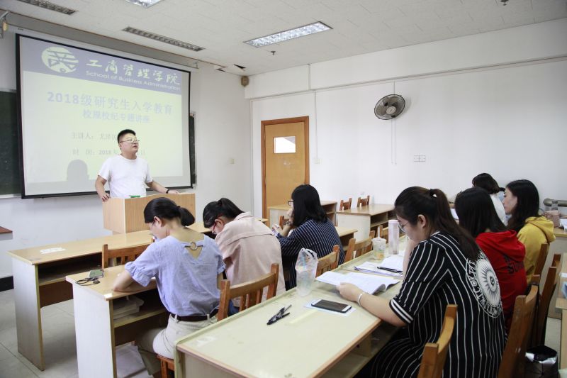 9月21日上午,工商管理学院2018级研究生入学教育校规校纪专题讲座在2号教学楼2406教室隆重举行。本次讲座由研究生辅导员尤泽民担任主讲,2018级全体研究生参加。