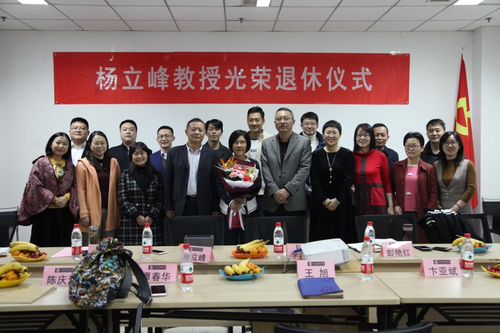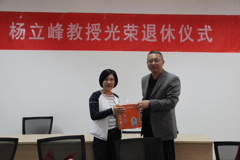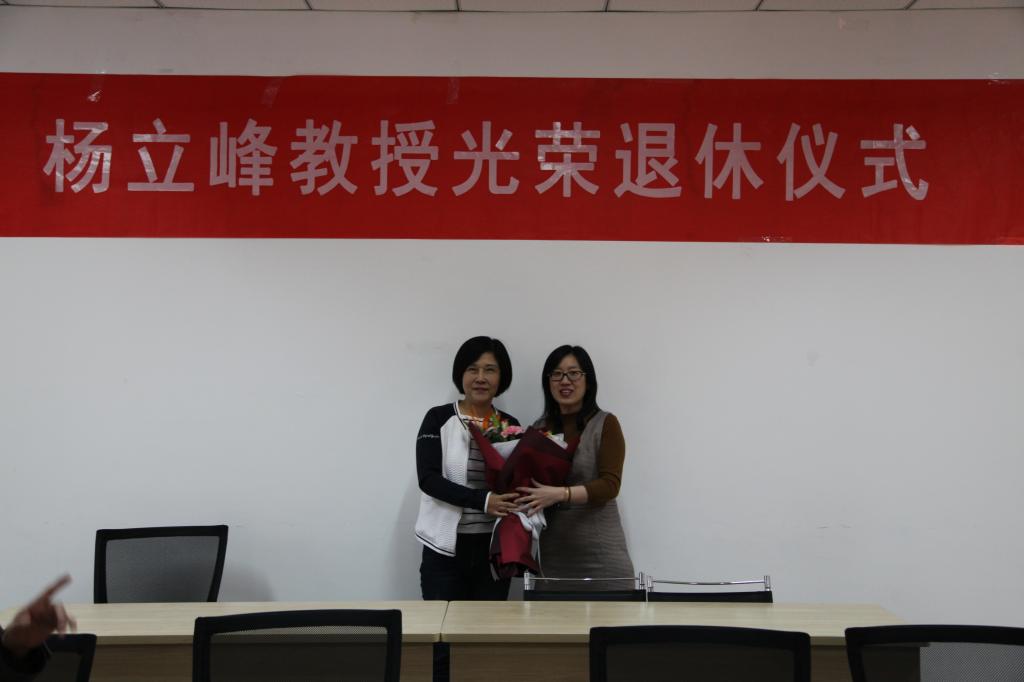 退休仪式结束后,学院领导及老师们向杨立峰教授赠送了礼物,青年教师代表向她献花,大家合影留念。