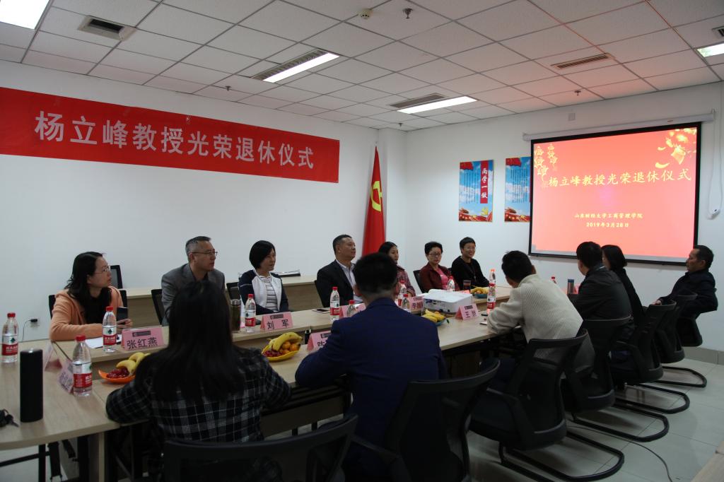 3月28日下午,工商管理学院于逸夫楼207会议室为杨立峰教授举办光荣退休仪式。工商管理学院班子成员,工商管理系部分教师代表出席。仪式由学院党委书记李旭刚主持。