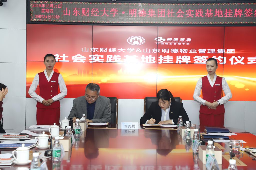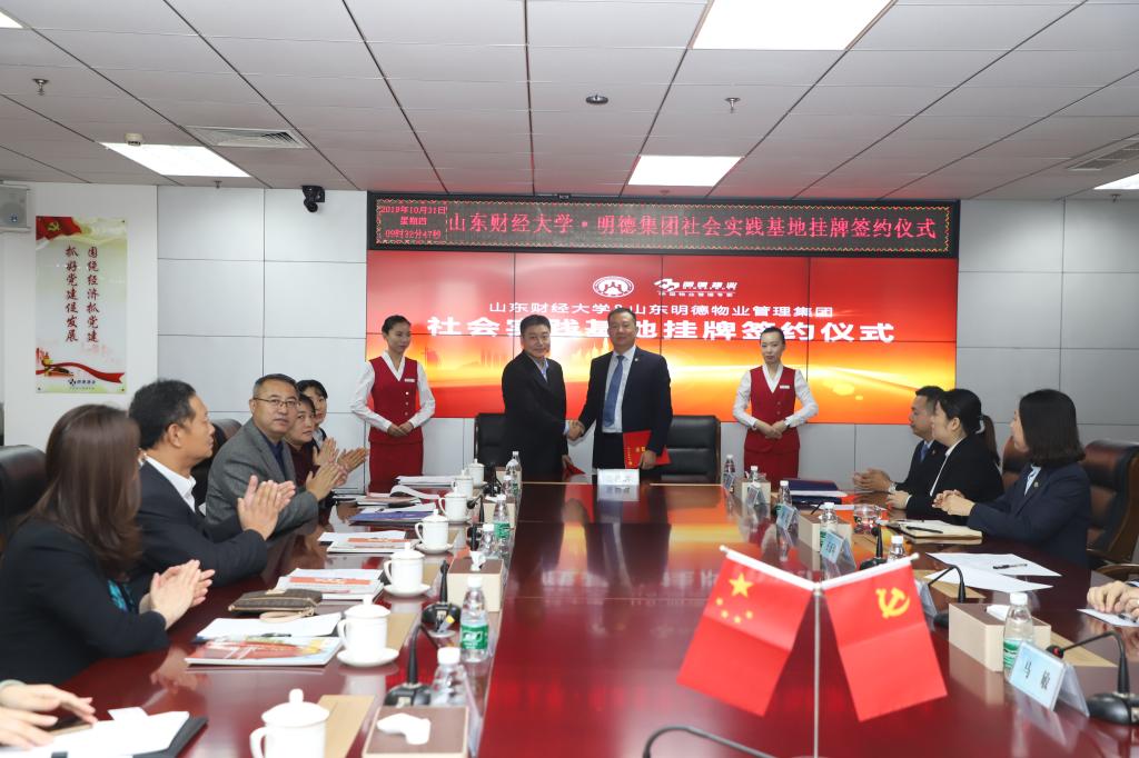 10月31日上午,我院与山东明德物业管理集团社会实践教学基地签约暨授牌仪式在明德集团党建会议室举行。山东明德物业管理集团董事执行总裁王正坤、副总裁邹心忠、副总裁金艺、人力资源中心总经理刘丹丹、山东财经大学合作发展处副处长邵伟然、工商管理学院党委书记李旭刚、院长刘军、党委副书记张红燕及企业相关人员、师生代表参加了本次签约暨授牌仪式。