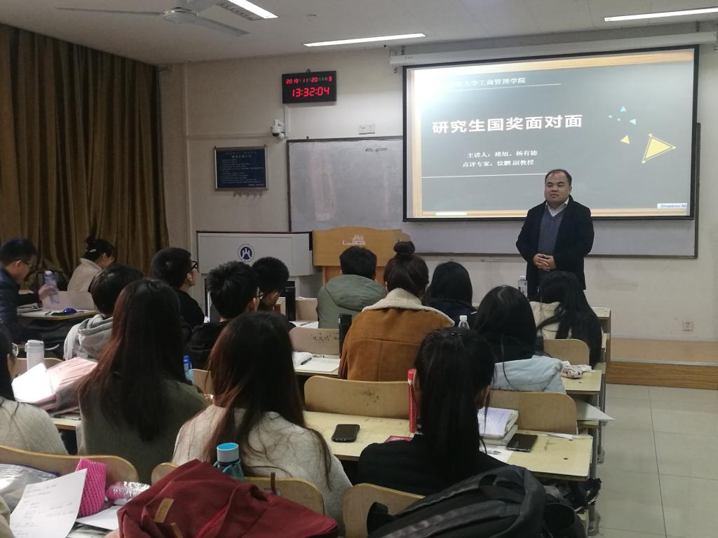 11月20日中午,我院2019年研究生“国奖面对面”科研经验分享会在燕山校区逸夫楼Y206教室举行。本次活动由2019年研究生国家奖学金获得者褚旭、校长奖学金获得者杨有德担任主讲,我院徐鹏副教授作为点评专家出席本次活动,2019级全体研究生参加。