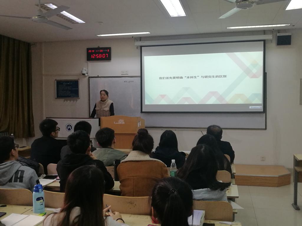 褚旭认为本科生是接受知识,研究生是创造知识,她结合自身科研和成长经历从课堂学习、团队学习和自主学习三个方面分享了科研的经验与技巧,他认为让通过课堂学习补充专业知识,通过团队学习聚焦研究方向,通过自主学习深挖兴趣选题,尤其在自主学习方面要多听、多读、多写。杨有德分享了自己在科研上遇到的态度和能力上的瓶颈以及应对的策略,告诉大家一个普通研究生怎么进行科研学习,他强调对错误的积累和总结很重要。