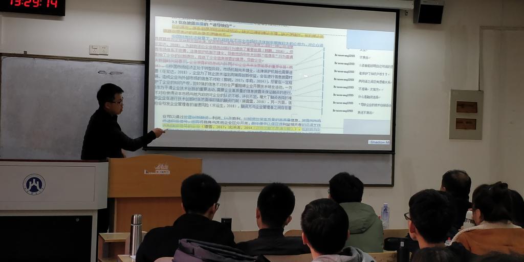 接下来徐鹏对两位同学的分享进行总结点评。他对获得国家奖学金和校长奖学金的同学表示了祝贺。徐鹏以快乐和幸福的区别引入此次点评,他强调不管决定是否要读博,科研都是每个研究生的主业,通过科研获得的逻辑思维和语言文字上提升,是无法替代的。