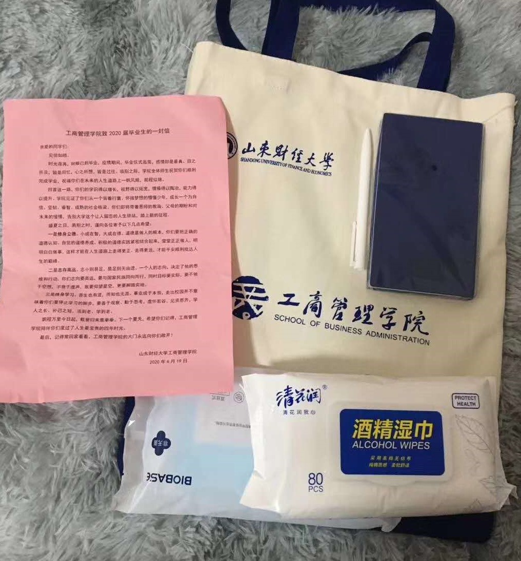 塞得鼓鼓的大礼包里,装满了学院的“小心思”:一个具有鲜明的学院特色的帆布包,望它能让同学们不时回忆起在财大求学的一点一滴,记住在这里的欢笑、泪水与成长;《致毕业生的一封信》,饱含了学院对毕业生的祝福与期许;印着工商管理学院字样的笔记本和签字笔,愿同学们能记录下生命中的温暖感动、肆意张扬和成长蜕变;消毒湿巾和口罩,希望没有辅导员关怀叮咛的学子们依然能守护好自己的健康。