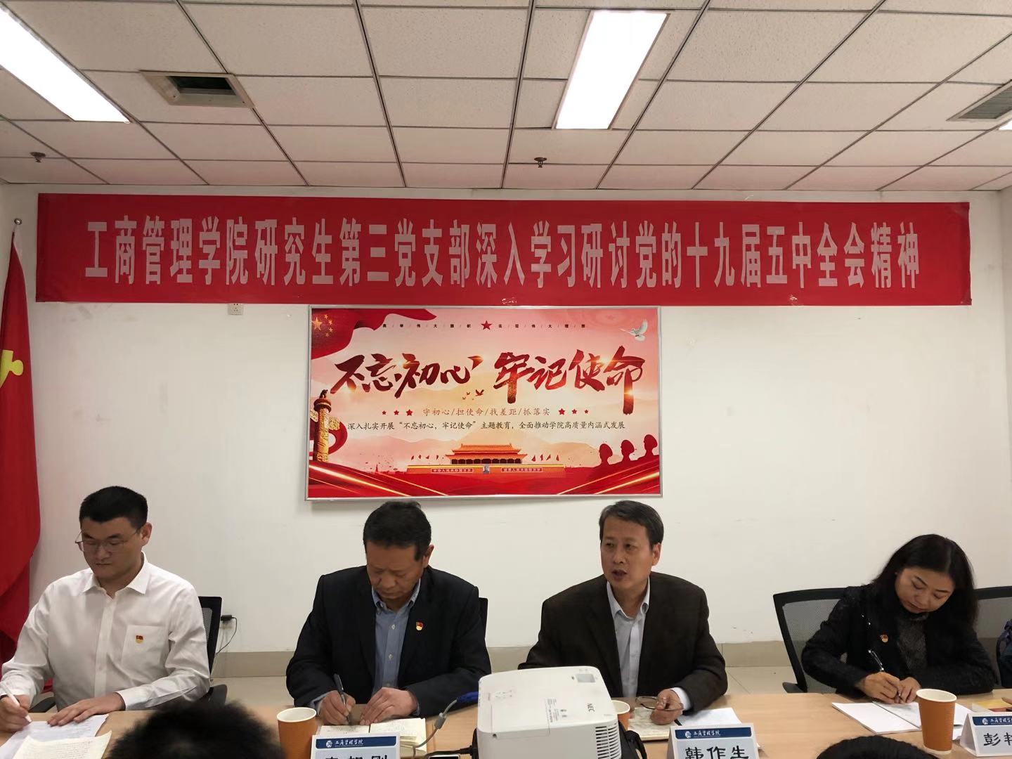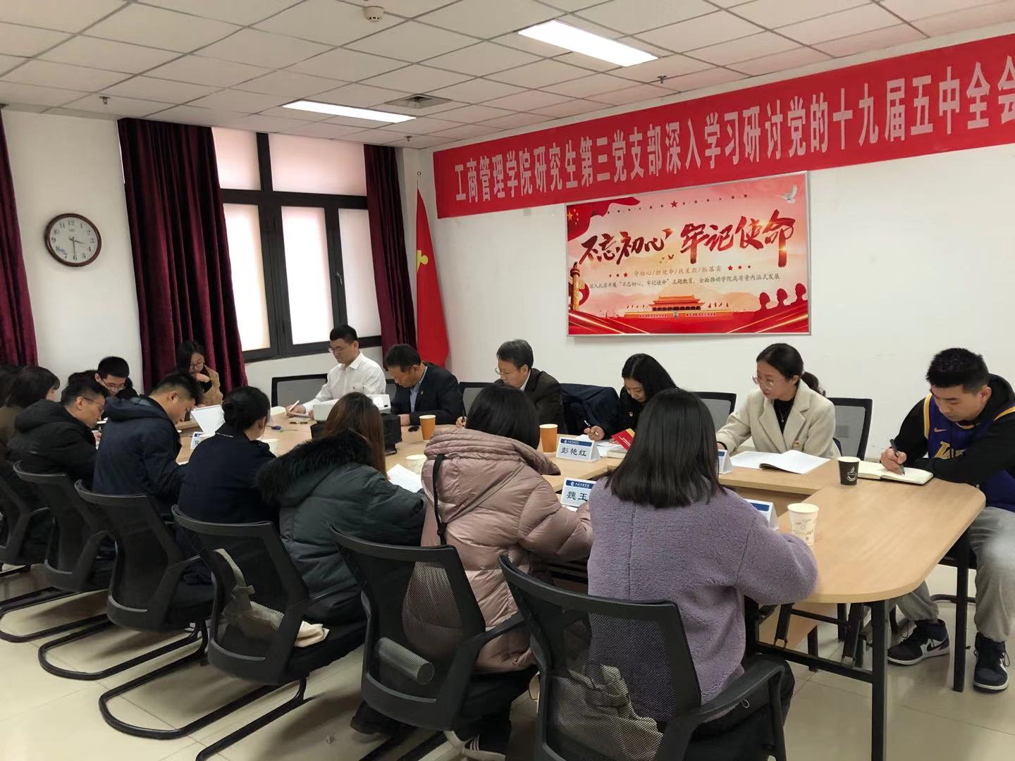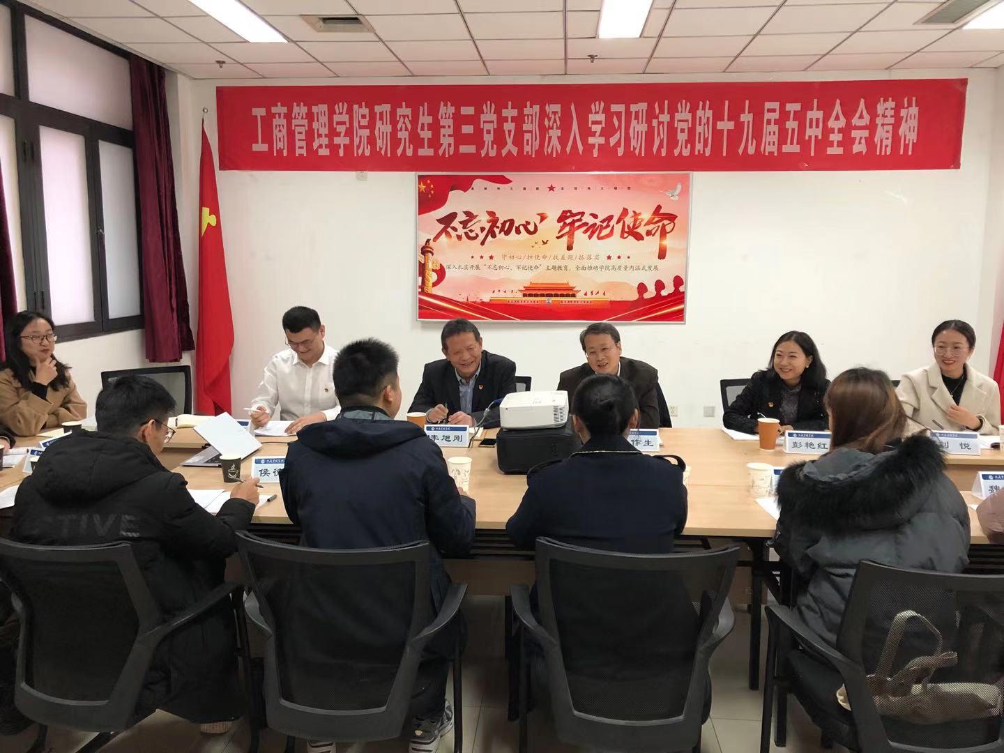 11月30日下午,工商管理学院研究生第三党支部召开“深入学习研讨党的十九届五中全会精神”座谈会,全面学习、领会党的十九届五中全会精神,校党委副书记韩作生出席活动并讲话。院党委书记李旭刚、副书记彭艳红和全体研究生第三党支部成员参加。