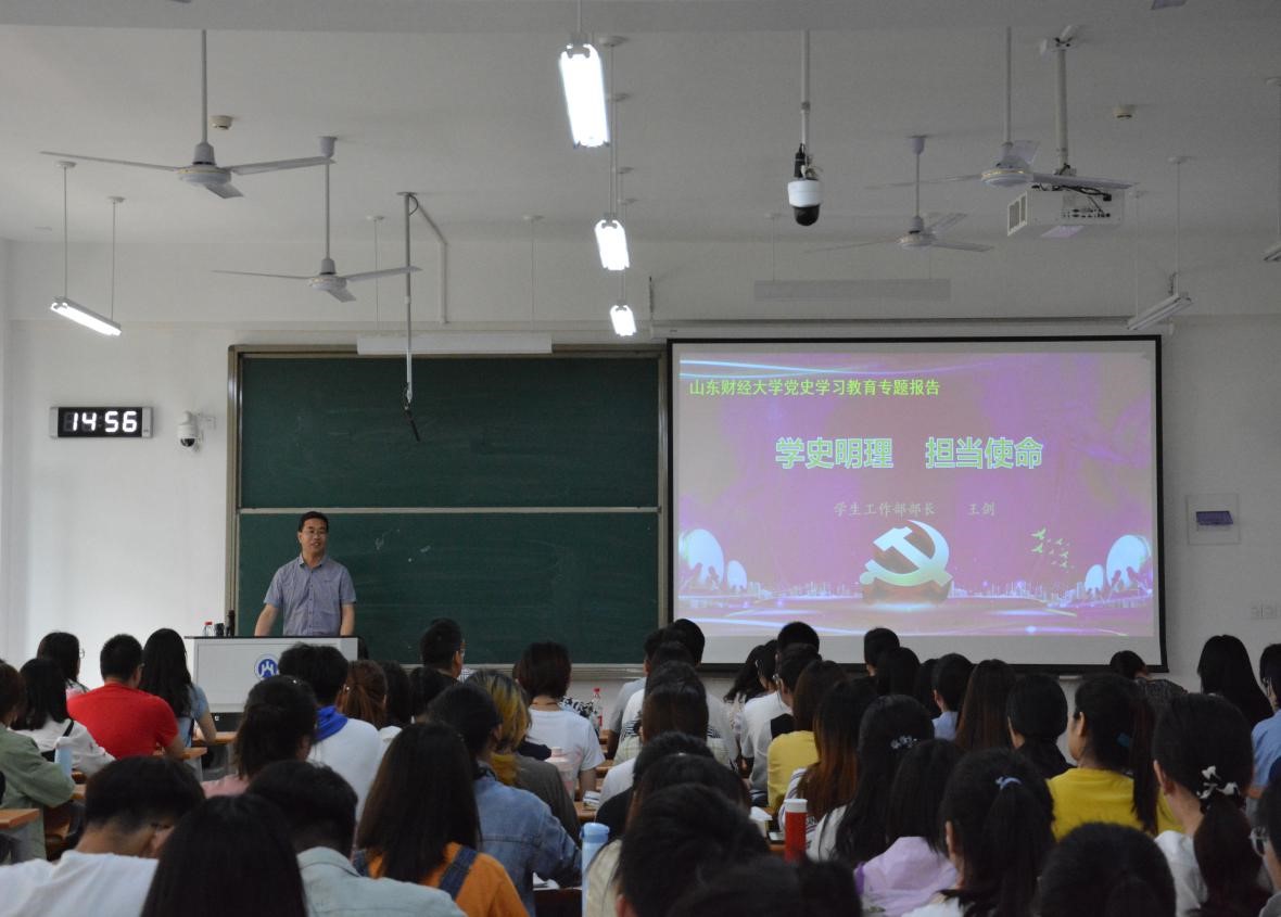 为进一步坚定大学生的理想信念,从历史中汲取精神力量,5月20日,工商管理学院举办“学史明理,担当责任”专题讲座。讲座由山东财经大学党委学工部部长、学生工作处处长、武装部部长、山东财经大学党史学习教育宣讲团成员王剑主讲,工商管理学院党委书记李旭刚主持,学院辅导员老师和130多名学生党员聆听了讲座。