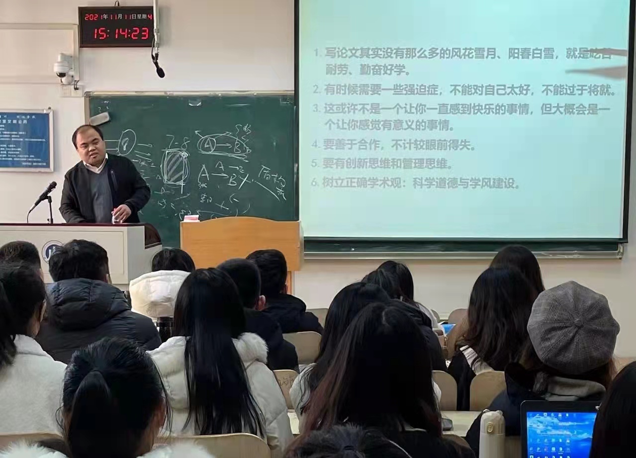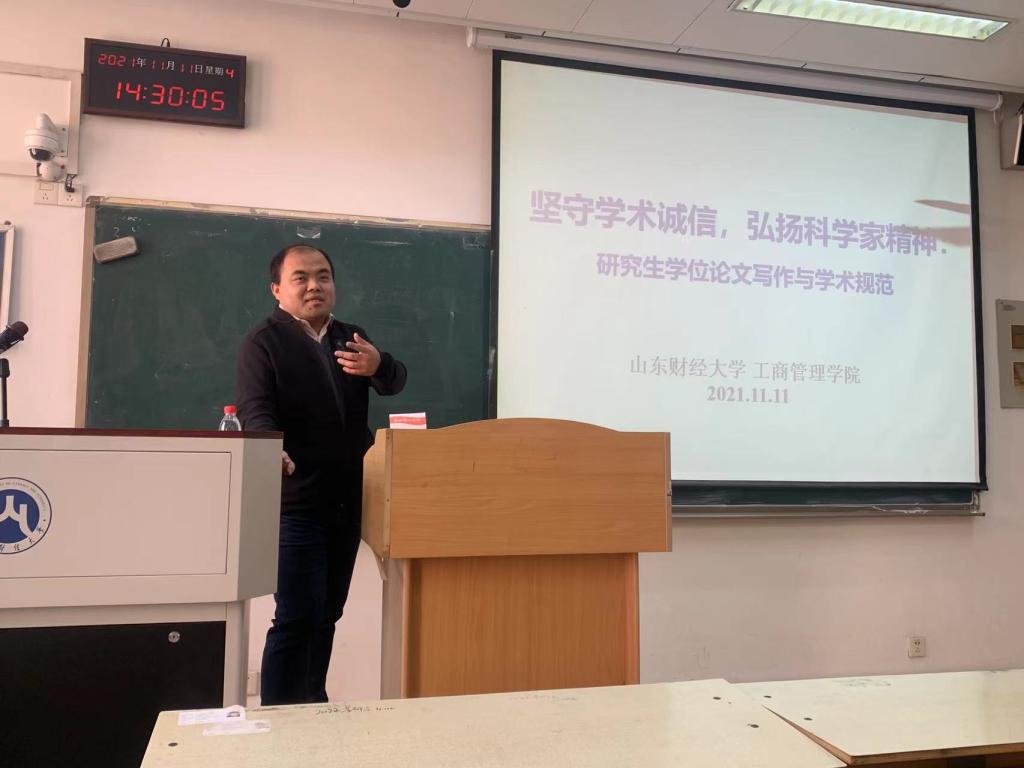 11月11日,工商管理学院在逸夫楼Y206教室举办了“坚守学术诚信,弘扬科学家精神—研究生论文写作与学术规范”讲座,徐鹏教授担任主讲,我院2020级全体研究生参加。
