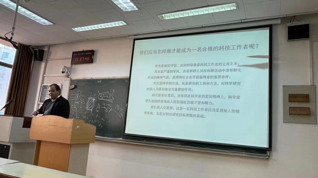 徐鹏向同学们提出,在科学研究的过程中,一定要有崇高的治学精神,严谨的治学态度,坚守好自己的治学原则。他给大家播放了一段严惩学术不端的视频,列举了科研不端行为的危害以及责任人需要承担的后果,通过鲜活的事例向大家强调坚持学术操守,遵守学术规范的重要性,要求研究生始终对学术保持敬畏,严于律己,踏实学好理论知识,共同营造良好的学术氛围和学术环境。
