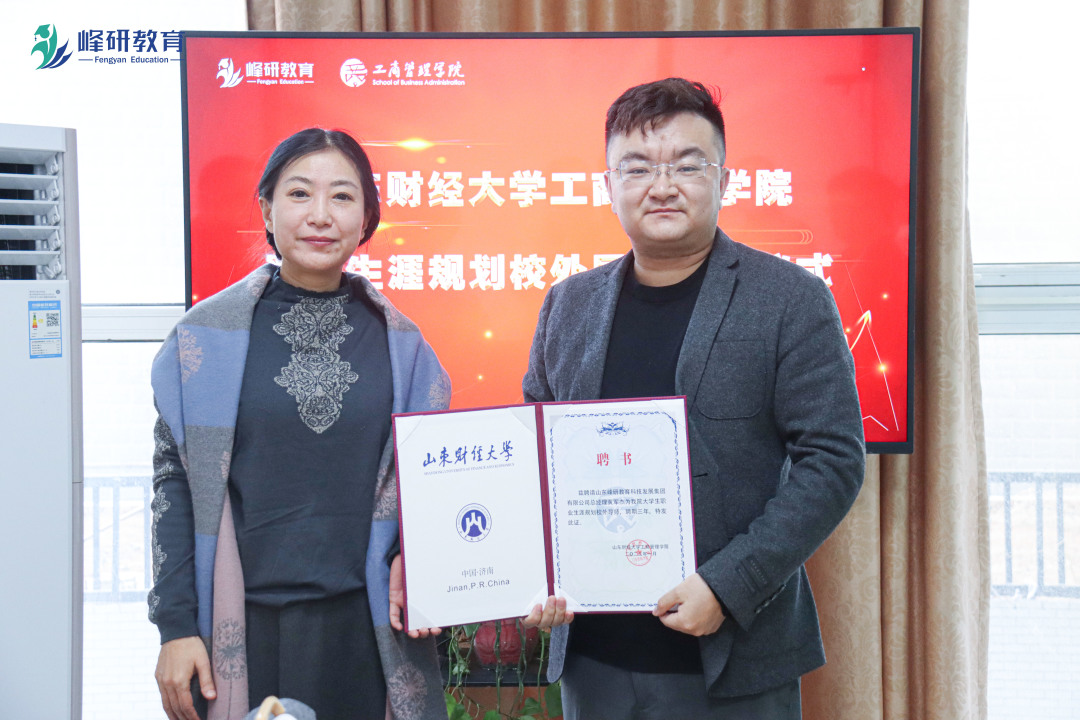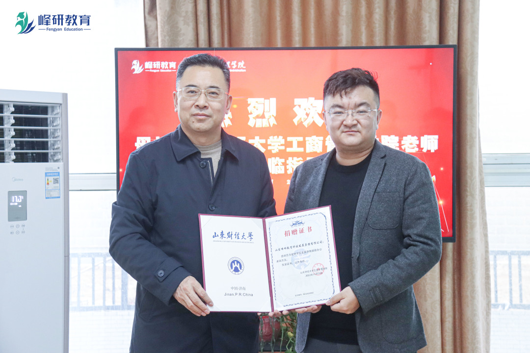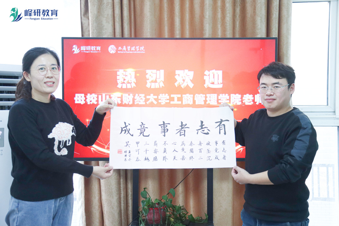 最后,峰研教研院代表老师田政、徐子程对学员备考状态及备考规划进行简单分享。赵世民等代表工商管理学院向黄军杰校友颁发了山东财经大学工商管理学院大学生职业规划校外导师聘书、捐赠证书及工商管理学院学生优秀字画。