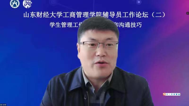 3月17日,工商管理学院辅导员工作论坛第二期顺利举行,辽宁农业职业技术学院党委学工部部长、学生处处长、“图说思政”创始人、“图说思政校园行”活动发起人尤长军,以“学生管理工作的语言艺术和沟通技巧”为题,进行了线上主旨报告。学院党委书记赵世民、副书记彭艳红、全体辅导员老师在燕山校区逸夫楼207会议室,与学校各学院、山东财经大学燕山学院、山东管理学院工商学院等全国多所高校的30多位学工同仁,共聚“云”端,共同聆听了报告。本次论坛由彭艳红主持。