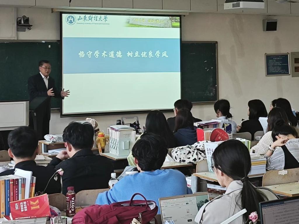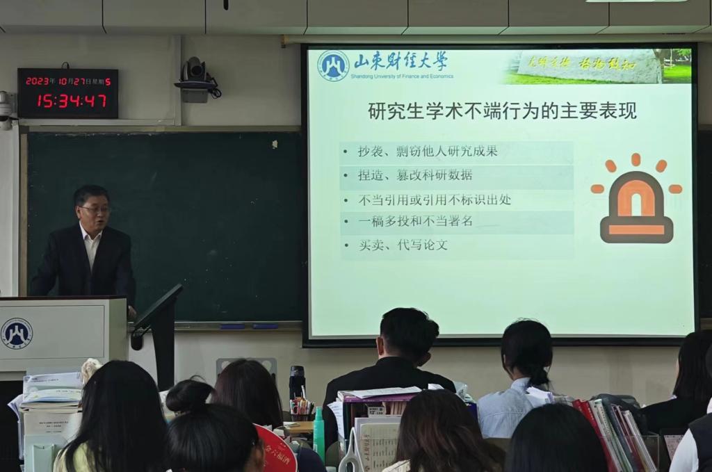 随后,杨明海教授与同学们分享了学术不端的案例,解读了山东财经大学关于研究生学术道德的相关制度文件,并给同学们提出了三点要求:第一,要端正学术态度,坚守学术诚信;第二,要遵守学术道德规范,不抄袭、不剽窃;第三,要保持谦逊的学术态度,对待学术问题要有敬畏之心。