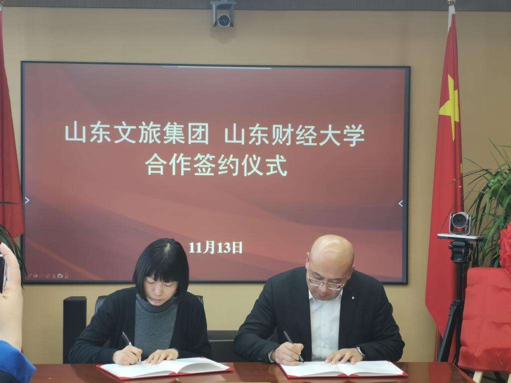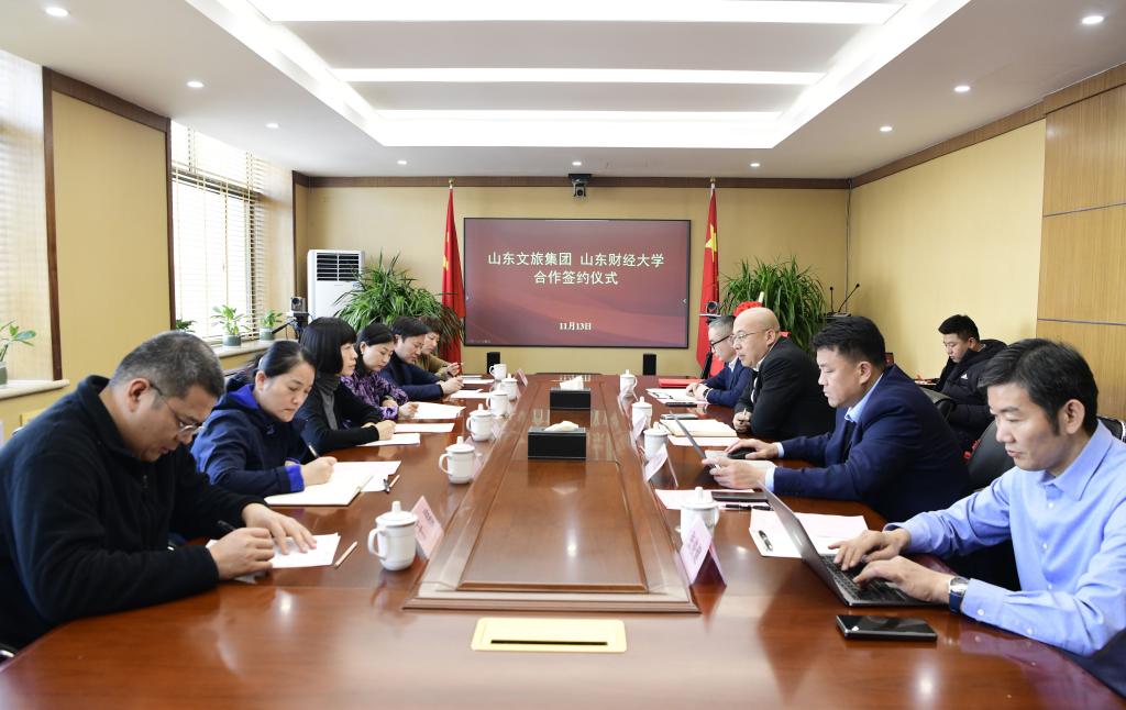 11月13日,山东财经大学与山东文旅集团合作签约暨校企协同育人基地揭牌仪式在山东文旅集团举行。山东文旅集团党委委员、副总经理孙超,集团政策研究部部长、山东文旅云智能科技有限公司董事长于伟,集团政策研究部副部长郑勇山,山东文旅集团数字未来发展有限公司总经理张俊健、山东财经大学工商管理学院长苏昕,人才发展中心主任兼副院长江岩、党委副书记彭艳红、侯昭瑾,文化和旅游系教师代表出席仪式。