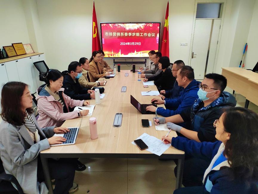 近日,市场营销系春季学期工作会议在逸夫楼207顺利召开。工商管理学院院长苏昕、党委副书记侯昭瑾、院长助理陈庆江及营销系全体教师出席,系主任刘侠主持会议。