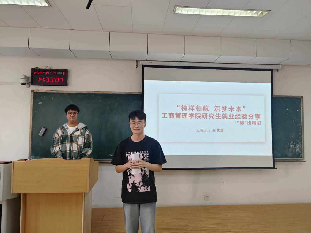 为不断提高我院研究生培养质量,提高同学们的学术素养,鼓励同学们继续深造。我院于4月17日下午在逸夫楼202举行“榜样领航助力未来”为主题的研究生就业经验分享会一:“博”出精彩。本次活动邀请了已被上海财经大学拟录取的2021级企业管理硕士研究生王艺霖主讲,会议由研究生会主席曹炳凯主持,研一、研二全体研究生参加。