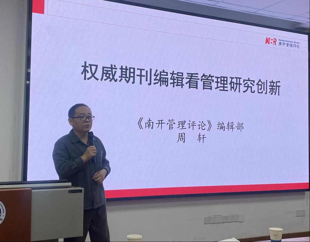 4月26日上午,工商大讲堂第129期暨“洞见·商道”校友讲坛第14期在燕山校区学景大酒店辅楼MBA学院204教室顺利举行。本次讲坛特邀《南开管理评论》编辑部主任周轩作题为“权威期刊编辑看管理研究创新”的学术报告。工商管理学院院长苏昕、学院相关教师和研究生参加了此次讲座,讲座由学院教学发展中心主任费振国主持。