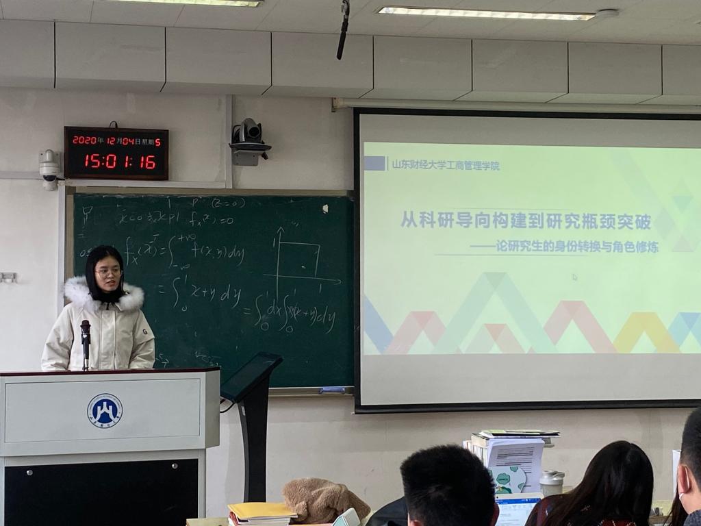 工商管理学院教授、硕士生导师刘素对两位国奖获得者的发言做出了点评,并向在座同学分享了自身的科研、学习经验,指出研究生要在日常学习生活中磨砺自己的科研技术能力;了解国际发展大趋势,多与国内国外更高层次的学者交流学习;树立终身学习的精神,让每一天都是充实学习的一天,都是有进步的一天。