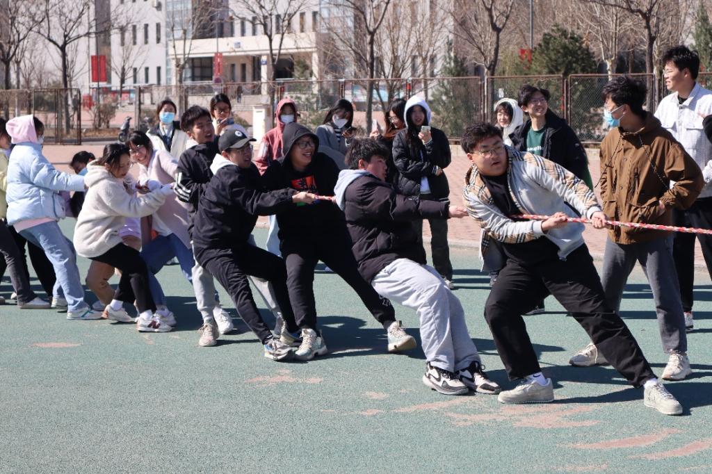 本次创意运动会中,2021级采用团体拔河的比赛方式,邻近两个班为一组,每组上场人数为16人(7男9女组成)。比赛共三轮,分为晋级赛,半决赛和决赛。实行抽签轮空制,两两比赛,三局两胜,轮空的组自动进入半决赛。春光灿烂,参赛队员齐心协力,抓紧拔河绳,全力以赴。观赛的同学们也个个热情高涨,为队伍呐喊助威。拔河比赛展现出队友们团结友爱、昂扬向上、顽强拼搏的精神,同时也激发了个人斗志,增强了班级凝聚力。