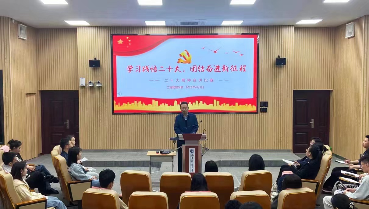 为进一步学习贯彻党的二十大精神,提高全体研究生思想政治理论素养,凝聚青年力量,激发青年活力。4月3日下午,工商管理学院在逸夫楼103报告厅举办主题为“学习践悟二十大,团结奋进新征程”的二十大精神宣讲比赛。工商管理学院党委书记赵世民,党委副书记彭艳红,研究生辅导员刘薇,学生党支部书记郭丽娟、赵萱及全体研究生参加。