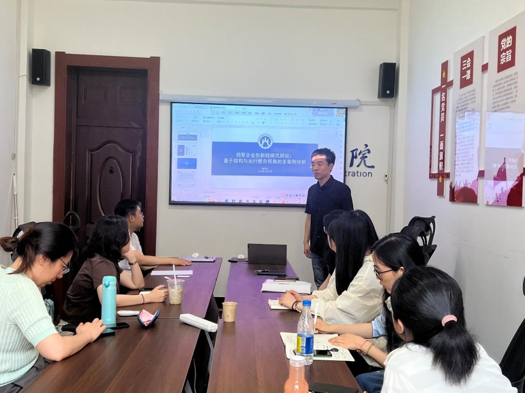 田鸣宇博士做了题为“领军企业创新链模式研究:基于结构与运行整合视角的多案例分析”的学术报告。田鸣宇从引言、理论基础、研究方法、案例分析与发现、研究结论五个部分进行了分享。研究基于结构和运行整合视角,通过对国家电网、华为、中国中车和恒瑞医药四个领军企业创新链构建方式进行多案例对比分析,明晰其内在运行机理,提炼领军企业创新链模式。研究发现领军企业创新链模式包含结构模式和运行模式两个维度,任何单一维度均无法对创新链模式进行准确刻画;因产品类型、技术创新路径存在差异,领军企业创新链模式各不相同。在报告后的讨论环节,与会老师和同学们就论文理论逻辑、研究方法及后续相关研究等方面进行了深入讨论与交流。