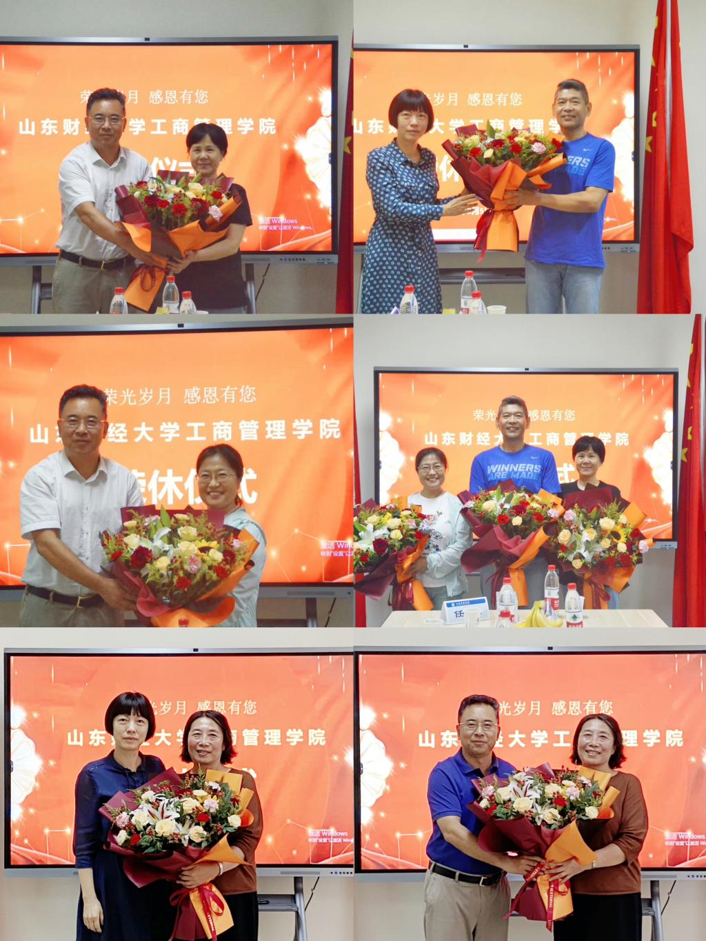 倾尽丹心育桃李,奉献韶华铸师魂。9月5日和6日,工商管理学院2024年度教职工荣休仪式在逸夫楼207举行。学院党委书记赵世民,院长苏昕,党委副书记彭艳红、侯昭瑾,学院工会副主席任传鹏,工商管理系主任兼教学发展中心主任费振国,市场营销系主任刘侠,文化和旅游系主任于伟,文化和旅游系副主任张彦,工商管理系工会组长张晴,荣休教师代表于强、曲英艳、刘菊湘、李季芳出席仪式。