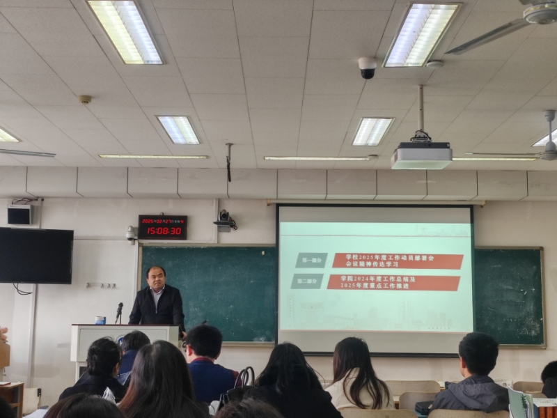院长徐鹏首先传达了学校2025年度工作动员部署会的核心要求,并深入学习了校党委书记查玉喜、校长洪俊杰在本次动员部署会上的重要讲话精神。随后,徐鹏系统回顾了2024年度学院在人才培养、科学研究、社会服务等方面的主要工作举措,总结了年度教育改革创新指标任务书的完成情况,并结合具体指标深入剖析了学院在学科建设、师资队伍、科研创新等方面存在的短板与不足,对学院发展面临的新形势、新挑战进行了全面分析和梳理。