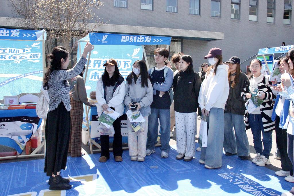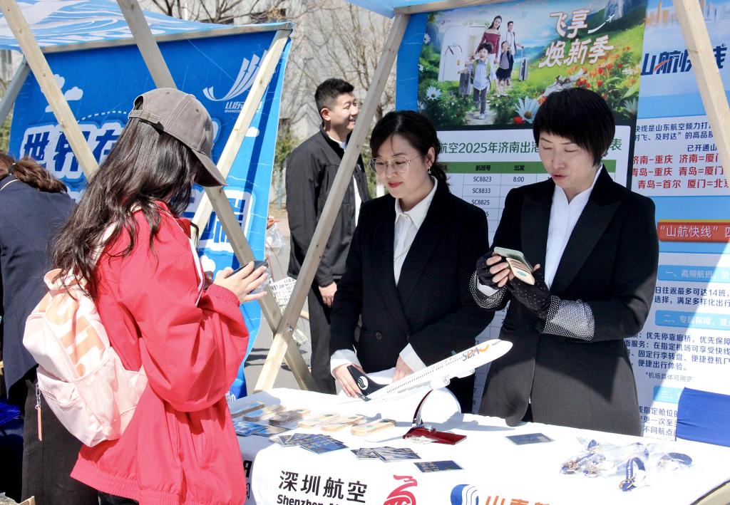 此次活动首次走进山东财经大学,以"航空+旅游"为主题搭建校企合作平台。淄博市文化和旅游局通过沉浸式文旅推介,既有传统文化知识竞答、"好客山东·淄博"景区门票减免政策解析,又创新推出春日樱花季赏花专线导览等体验项目,生动展现了"山水淄博"文旅资源禀赋。机场、文旅部门、航司及旅行社多方联动,为师生立体化呈现"航空+旅游"产业链服务,持续激活高校群体航空出行市场新动能。各大航空公司及旅行社针对学生群体推出"机票+酒店"、"往返特惠套餐"等专属产品,让师生以更实惠的价格畅享旅程。此外活动特别设置"飞行模拟体验区""旅游攻略设计赛"等互动环节,同学们在沉浸式体验中规划属于自己的"青春航线"。在“旅行转转乐”游戏区,大家通过掷骰子的方式赢得精美小礼品,近百名师生现场参与。活动现场还发放了定制文创礼包,包含济南机场主题明信片、淄博文旅手绘地图等纪念品。