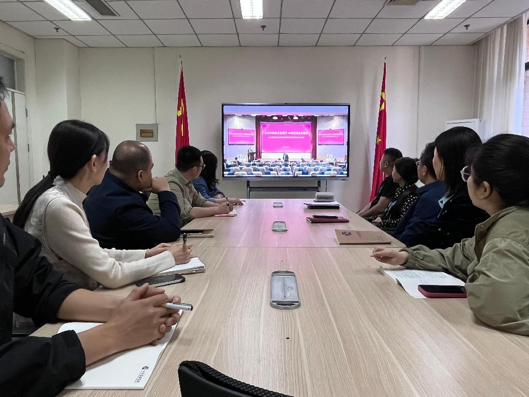 4月24日上午,山东省教育厅组织召开“弘扬践行教育家精神”宣讲活动,工商管理学院组织全体教职工在线收听收看。党委书记赵世民、院长徐鹏、副书记彭艳红、郑大伟、副院长陈庆江,以及辅导员和办公室行政人员在逸夫楼207会议室集体收看活动。同时组织各系教师以集中与分散相结合的方式在线观看“山东省弘扬教育家精神”活动直播。