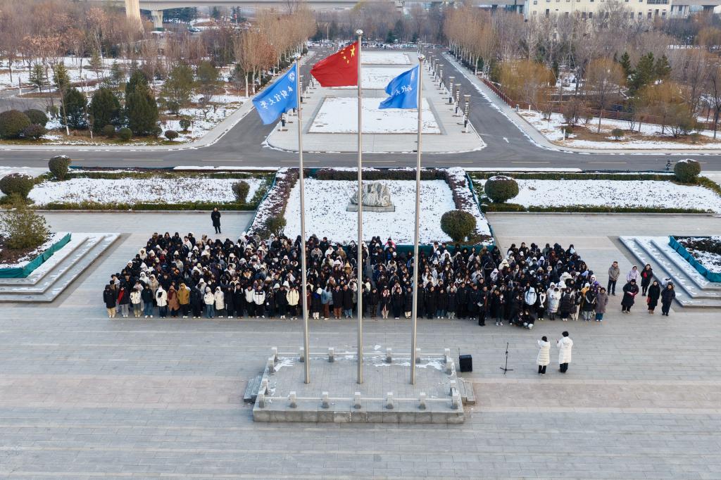 12月15日,工商管理学院与龙山荣誉学院在章丘校区图书馆广场联合举行升旗仪式。辅导员陈盈君、任康、尤泽民、范雅欣及500余名学生代表共同参加。