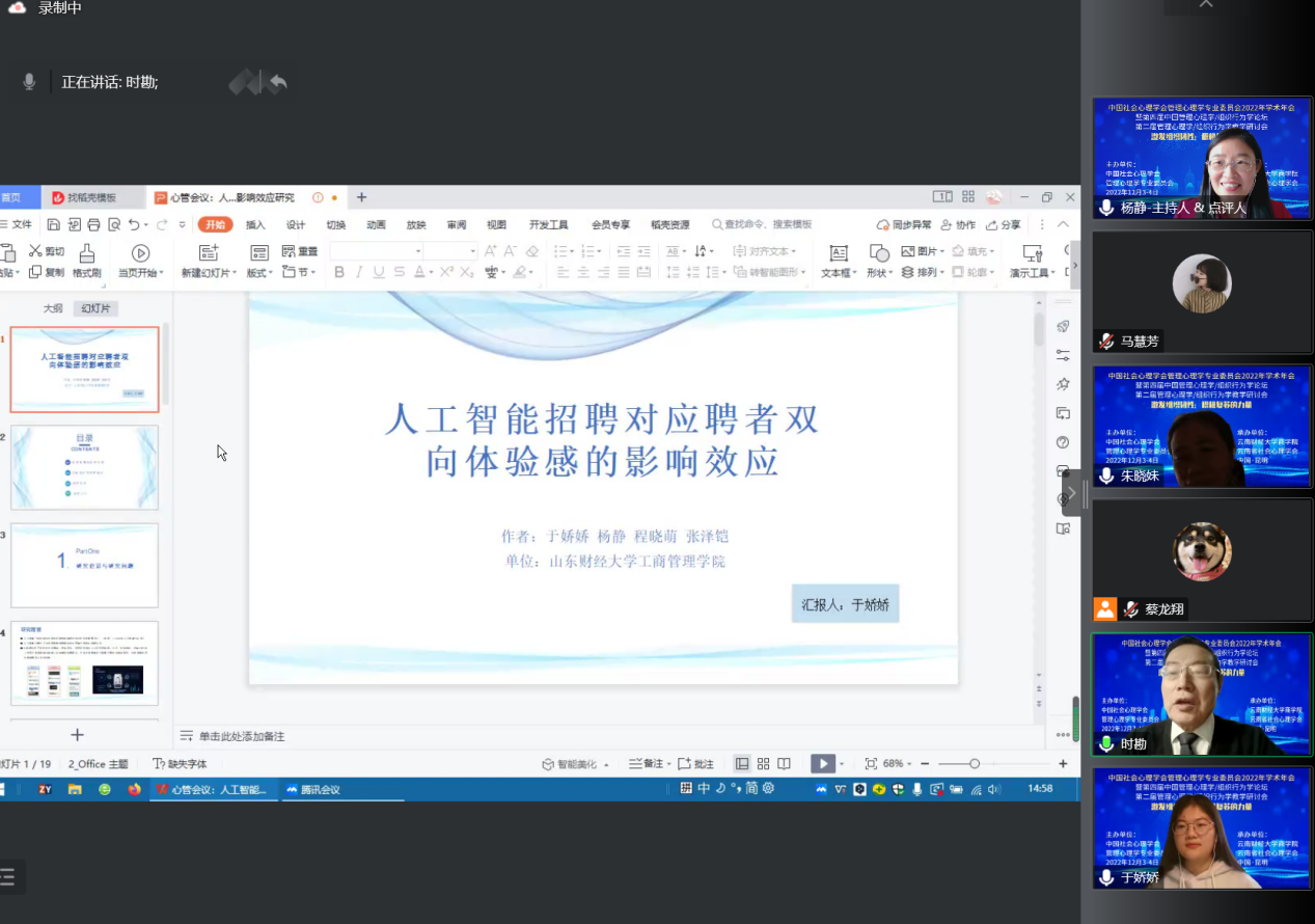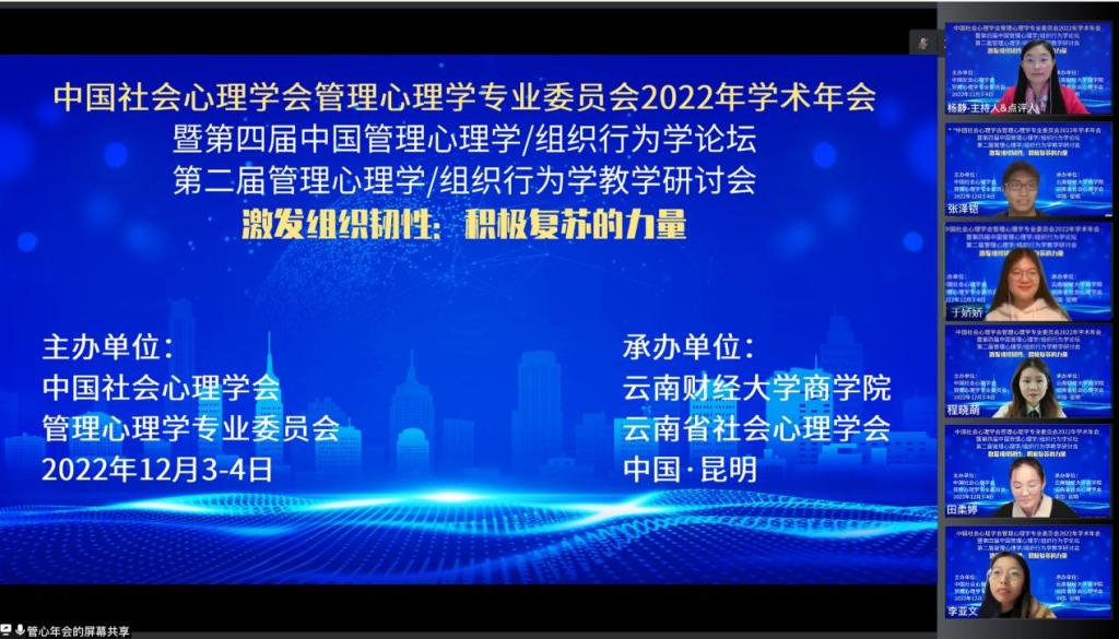 12月3日—4日由中国社会心理学会管理心理学专业委员会主办、云南财经大学商学院和云南省社会心理学会联合承办的第四届中国管理心理学/组织行为学论坛以线上形式举办。本届学术年会以“激发组织韧性:积极复苏的力量”为主题,来自中国科学院心理研究所、北京大学、中国人民大学等高校的师生参加了本届论坛,共计16万多人次在线参会。我院教师杨静副教授及其指导的硕士研究生张泽铠、程晓萌、于娇娇、田柔婷和李亚文5位同学参加了本届学术年会。